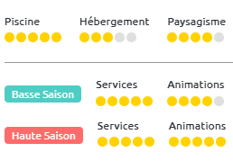 - Animations : est déterminé en fonction du nombre d’activités pour tous les âges, du programme d’animations proposé au sein-même du camping-village (en haute et basse saison)